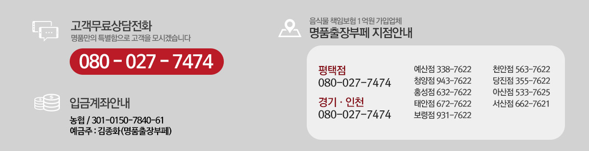 예산사무소 : 충남예산군 고덕면 대천리 1구 770-1번지 명품출장부페 | 무료전화 080-027-7474 | 041-338-7622 / 010-7174-8055